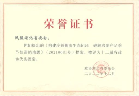 1月8日,省政协第十二届常委会第二十次会议上,对省政协十二届一次会议以来的100件优秀提案进行了表彰,其中民盟省委提交的集体提案中有4件被评为“优秀提案”。由民盟地大副主委、公司秦屹副教授执笔撰写的“构建冷链物流生态闭环,破解农副产品季节性滞销难题”提案被评为十二届省政协优秀提案。该提案源于国药控股湖北有限公司副董事长马占军负责的课题、秦屹执笔撰写的调研报告,后作为集体提案在2021年省政协十二届四次会议上由民盟湖北省委提交。